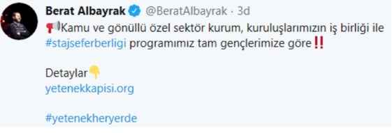 Hazine ve Maliye Bakanı Berat Albayrak, Cumhurbaşkanlığı tarafından başlatılan staj seferberliğine ilişkin bir paylaşımda bulundu. Bakan Albayrak, "Kamu ve gönüllü özel sektör kurum, kuruluşlarımızın iş birliği ile staj seferberligi programımız tam gençlerimize göre" dedi.