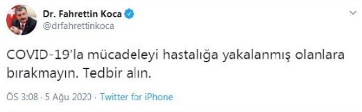 Sağlık Bakanı Fahrettin Koca, sosyal paylaşım sitesi Twitter'daki hesabından, korona virüsle mücadeleye dikkat çekmek amacıyla mesaj yayımladı. Bakan Koca, paylaşımında, "Covid-19'la mücadeleyi hastalığa yakalanmış olanlara bırakmayın. Tedbir alın" dedi.