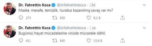 Sağlık Bakanı Fahrettin Bakanı Koca, sosyal medya Twitter hesabından, korona virüs tedbirlerine dikkat çekmek amacıyla iki paylaşımda bulundu.