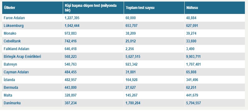 Kişi başına düşen test sayısında lider konumdaki ülke, sadece 324 vakanın görüldüğü, Kuzey Atlantikte'ki Faroe Adaları. Nüfusu 48 884 olan adalar topluluğunda yapılan toplam test sayısı ise 60 bin. (Faroe Adaları, Birleşik Krallık'a bağlı olmasına rağmen içişlerinde özerk yönetime sahip).