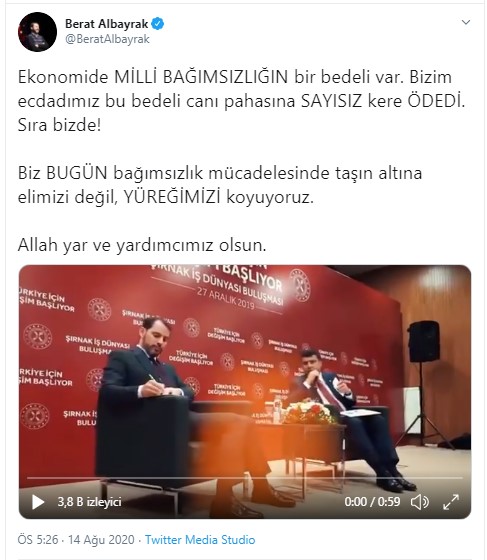 Hazine ve Maliye Bakanı Berat Albayrak twitter hesabından şu açıklamayı yaptı: