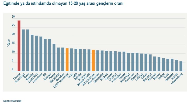 Son 10 yılda en çok iyileşme kaydeden ikinci ülke olmasına rağmen Türkiye'de, eğitimde veya istihdamda olmayan (NEET) genç nüfusun oranı, OECD ülkelerinin ortalamasının neredeyse iki katı. Türkiye'yi NEET sıralamasında yüzde 23,7 ile İtalya ve Kolombiya takip etti. OECD üyeleri arasında NEET oranı en düşük ülke yüzde 5,5 ile Lüksemburg oldu.