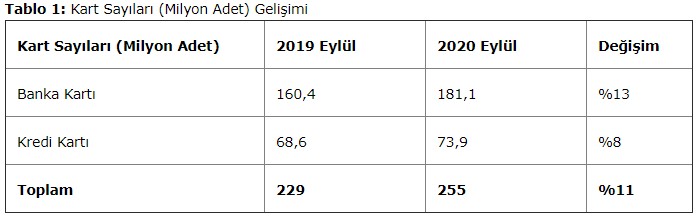 Bankalararası Kart Merkezi (BKM), 2020 yılının eylül ayına ilişkin verilerini açıkladı. BKM'nin verilerine göre, eylül ayı sonunda Türkiye'de 73,9 milyon adet kredi kartı, 181,1 milyon adet banka kartı kullanılıyor. 2019 yılının eylül ayı ile kıyaslandığında kredi kartı sayısında yüzde 8'lik, banka kartı sayısında ise yüzde 13'lük artış görülüyor. Toplam kart sayısı ise 255 milyon adede ulaşarak geçen yılın aynı dönemine göre yüzde 11 oranında artış gösterdi.