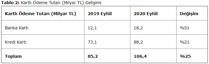 BKM verilerine göre, banka kartları ve kredi kartları ile eylül ayında toplam 106,4 milyar TL'lik ödeme yapıldı. Bu tutarın 88,2 milyar TL'si kredi kartları ile ödenirken, 18,2 milyar TL'sinde banka kartları kullanıldı. Büyüme oranları özelinde incelendiğinde banka kartıyla yapılan ödemelerde bir önceki yılın aynı dönemine göre büyüme oranı yüzde 51 olurken, kredi kartıyla yapılan ödemelerde ise bu oran yüzde 21 olarak gerçekleşti. Toplam kartlı ödemeler büyümesi ise yüzde 25 oldu.