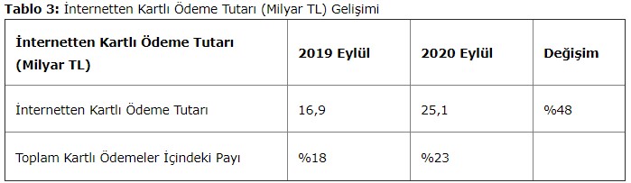 İnternetten kartlı ödemeler her geçen gün yaygınlaşmaya devam ederken, hayatın her alanında tercih edilen en önemli ödeme araçlarından biri haline geldi. Eylül ayında, internetten kartlı ödeme tutarı, geçen yılın aynı dönemine göre yüzde 48 artarak 25 milyar TL'yi geçti. Geçen yılın aynı döneminde yüzde 18 olan internetten kartlı ödemelerin toplam kartlı ödemelerdeki payı da yüzde 23'e ulaştı, yani her 4 TL kartlı ödemenin 1 TL'si internetten gerçekleşti.