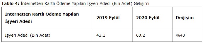 İnternetten ödemelerin tüm sektörlerde hızla yaygınlaşmasıyla beraber internetten ödeme yapılabilen işyeri sayısı da artışını sürdürdü. Birçok yeni işyerinin internet üzerinden hizmet vermeye başladığı görülürken, eylül ayında internetten kartlı ödeme gerçekleşen işyeri adedi geçen yıla göre yüzde 40 artarak 60 bini geçti.