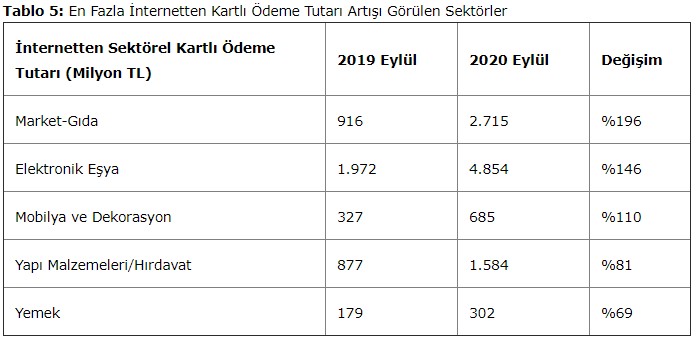 Eylül ayında internetten yapılan kartlı ödemelerin sektör detayında dağılımı incelendiğinde geçen yılın aynı dönemine göre en fazla artışın yüzde 196 ile market-gıda sektöründe olduğu görülüyor. Market-gıda sektörünü yüzde 146 artışla elektronik eşya, yüzde 110 artışla mobilya ve dekorasyon, yüzde 81 artışla yapı malzemeleri ve yüzde 69 artışla yemek sektörleri takip etti.