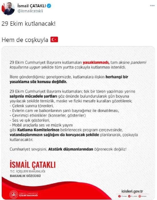 Çataklı, Twitter hesabından yaptığı paylaşımda, 29 Ekim Cumhuriyet Bayramı kutlamalarının yasaklandığı iddialarını yalanladı. Çataklı, "Tam aksine pandemi koşullarına uygun şekilde tüm yurtta coşkuyla kutlanması istenildi." değerlendirmesinde bulundu.