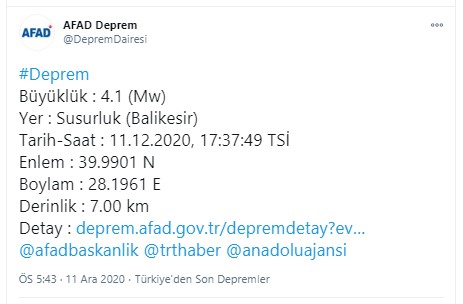 Gelişmelerin takip edildiğini bildiren AFAD, “Susurluk ilçesinde meydana gelen deprem sonrası, an itibarıyla, olumsuz bir ihbarın bulunmadığı bilgisi alınmıştır” açıklaması yaptı.