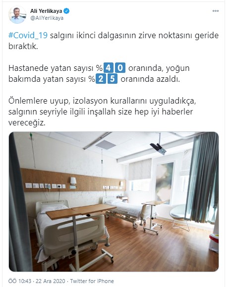 İstanbul Valisi Ali Yerlikaya yaptığı paylaşımda, "Kovid-19 salgını ikinci dalgasının zirve noktasını geride bıraktık. Hastanede yatan sayısı yüzde 40 oranında, yoğun bakımda yatan sayısı yüzde 25 oranında azaldı" dedi.