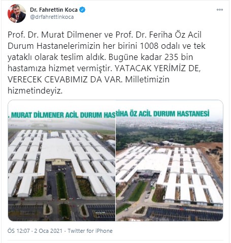 Prof. Dr. Murat Dilmener ve Prof. Dr. Feriha Öz Acil Durum Hastanelerimizin her birini 1008 odalı ve tek yataklı olarak teslim aldık. Bugüne kadar 235 bin hastamıza hizmet vermiştir. YATACAK YERİMİZ DE, VERECEK CEVABIMIZ DA VAR. Milletimizin hizmetindeyiz.