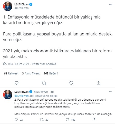 Elvan twitter hesabından yaptığı paylaşımda, mali disiplini kaliteli ve istikrarlı bir yapıya kavuşturacak tedbirleri de alacaklarını ifade etti.