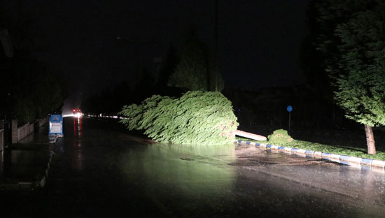 Mimar Sinan Bulvarı, Tarzan Bulvarı, Erler Caddesi, Çamlık Sokak'ta aydınlatma direkleri ve ağaçlar yola ve park halindeki otomobillerin üzerine devrildi.