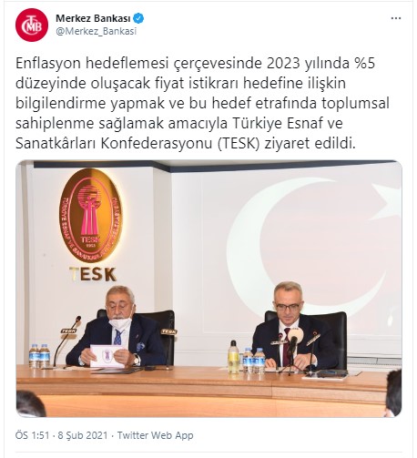 Merkez Bankası Başkanı Naci Ağbal TESK ziyareti sonrasında yapılan açıklamada, “Enflasyon hedeflemesi çerçevesinde 2023 yılında %5 düzeyinde oluşacak fiyat istikrarı hedefine ilişkin bilgilendirme yapmak ve bu hedef etrafında toplumsal sahiplenme sağlamak amacıyla Türkiye Esnaf ve Sanatkârları Konfederasyonu (TESK) ziyaret edildi” denildi.