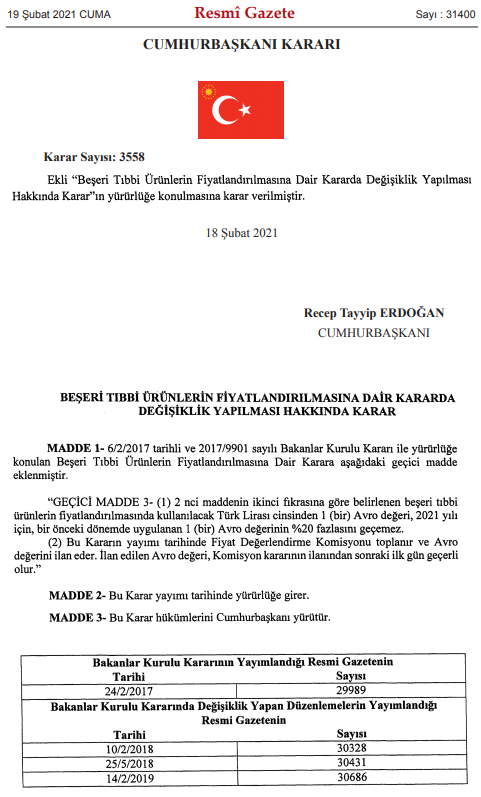 Bloomberg HT'den Tahsin Akça'nın haberine göre, düzenlemeyle söz konusu karara eklenen maddede, "Beşeri tıbbi ürünlerin fiyatlandırılmasında kullanılacak TL cinsinden 1 Euro değeri, 2021 yılı için bir önceki dönemde uygulanan 1 euro değerinin yüzde 20 fazlasını geçemez. Bu kararın yayımı tarihinde Fiyat Değerlendirme Komisyonu toplanır ve euro değerini ilan eder" denildi.