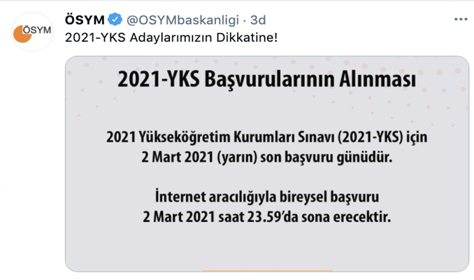 ÖSYM’nin Twitter hesabından yapılan paylaşımda, “2021 YKS için 2 Mart 2021 son başvuru günüdür. İnternet aracılığıyla bireysel başvuru 2 Mart 2021 saat 23.59’da sona erecektir” ifadesi kullanıldı.