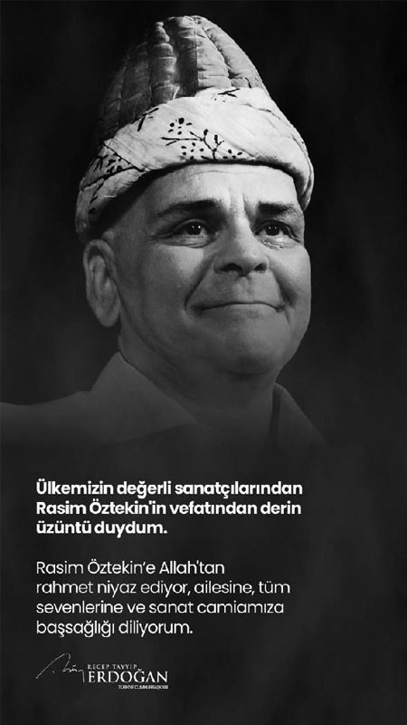 Cumhurbaşkanı Recep Tayyip Erdoğan, kalp rahatsızlığı sonrası kaldırıldığı hastanede hayatını kaybeden sanatçı Rasim Öztekin için başsağlığı mesajı yayımladı.