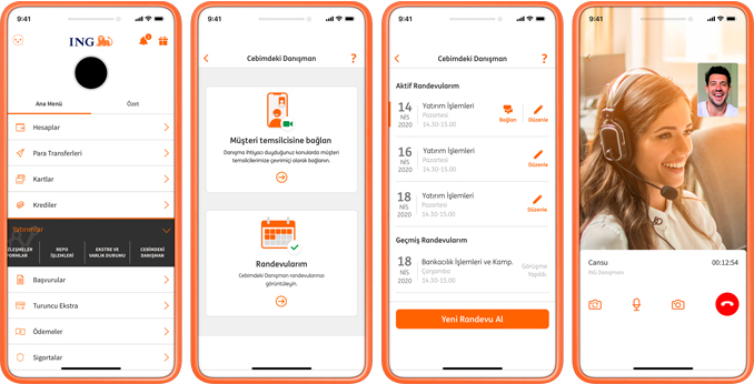 Türkiye’nin lider dijital kurumu olmayı hedefleyen ING, Cebimdeki Danışman ile ING Mobil üzerinden müşterilerine yatırım ürünleri alanında özel bir hizmet sunuyor. Görüntülü görüşme teknolojisi ile dijitale insan dokunuşu getiren ING Türkiye, Cebimdeki Danışman ile bankacılığı kolay ve zahmetsiz hale getiriyor. Müşteriler hafta içi 9.00 – 18.00 saatleri arasında ister anında, ister randevu alarak uzman ekiple görüntülü görüşme yapabiliyor, tüm yatırım ürünleri hakkında ayrıntılı bilgi edinebiliyor, yatırım işlemleri konusunda ihtiyaç duydukları desteği alabiliyor. 100 bin ile 1 milyon TL arasında birikimi olan müşterilerin yararlanabileceği Cebimdeki Danışman ilk etapta yatırım ürünleri hakkında hizmet veriyor.