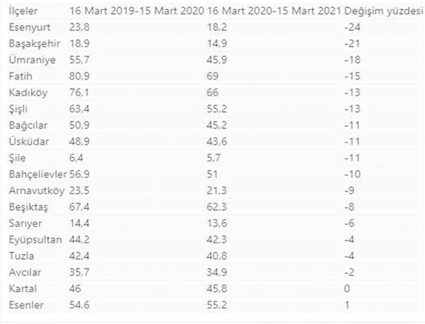 Aynı döneme göre, kentte hava kirliliği sadece Esenler'de yüzde 1 artış gösterdi. Kentte bir yıl öncesine göre hava kirliliğinin en fazla azaldığı ilçelerin başında yüzde 24 ile Esenyurt yer alırken, bunu yüzde 21 ile Başakşehir, yüzde 18 ile Ümraniye ve yüzde 15 ile Fatih izledi.