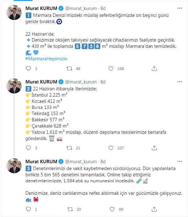 Çevre ve Şehircilik Bakanı Murat Kurum, Twitter'daki hesabından yaptığı açıklamada, 'Marmara Denizi'ni Koruma Eylem Planı' çerçevesinde, müsilaj seferberliğinde 15'inci günü geride bıraktıklarını belirtti. Kurum, "22 Haziran'da denizimize oksijen takviyesi sağlayacak cihazlarımızı faaliyete geçirdik. 430 metreküp ile toplamda 5 bin 738 metreküp müsilajı Marmara'dan temizledik. 22 Haziran itibarıyla illerimizde; İstanbul 2.225 metreküp, Kocaeli 412 metreküp, Bursa 133 metreküp, Tekirdağ 153 metreküp, Balıkesir 577 metreküp, Çanakkale 628 metreküp, Yalova 1610 metreküp müsilajı, düzenli depolama tesislerimize bertarafa gönderdik" dedi.