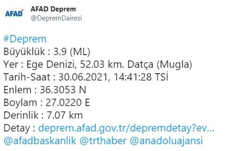 Muğla'nın Datça ilçesi açıklarında deprem meydana geldi. Depremin büyüklüğünü 3.9 olarak açıklayan AFAD, sarsıntının yerin 7 kilometre derinliğinde oluştuğunu kaydetti.