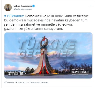 Türkiye Cumhuriyet Merkez Bankası (TCMB) Başkanı Prof. Dr. Şahap Kavcıoğlu, 15Temmuz Demokrasi ve Milli Birlik Günü dolayısıyla yayınladığı paylaşımda şehitlere rahmet diledi.
