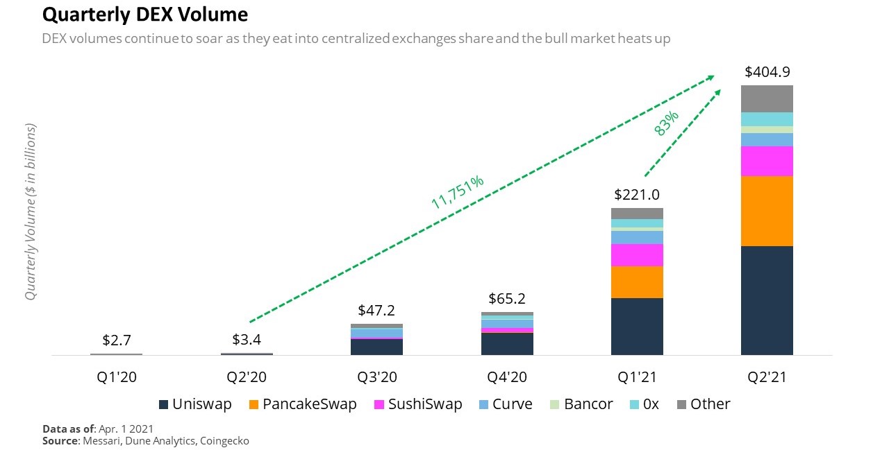 Messari verilerine göre, 2021'in ikinci çeyreğinin sonundaki üç aylık merkeziyetsiz borsa (DEX) işlem hacmi 404,9 milyar dolarla rekor kırdı.