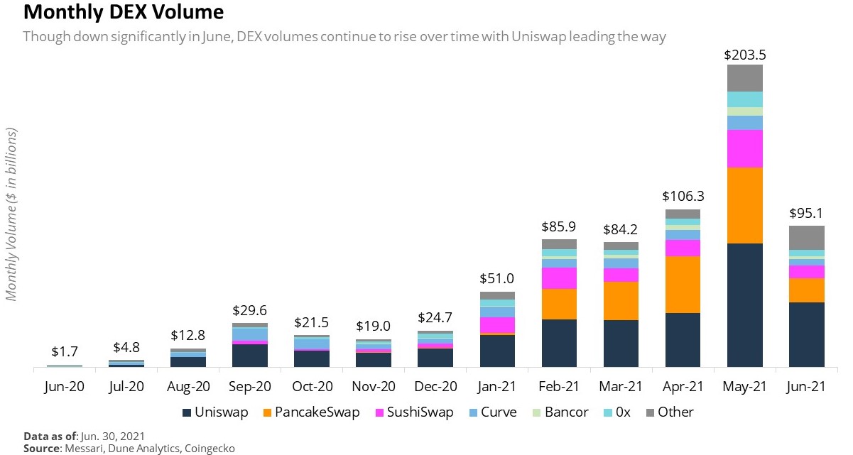 DEX işlem hacimleri, mayıs ayında 203,5 milyar dolarken haziran ayında 95,1 milyar dolara indi. Bu değer, kaydedilen en yüksek üçüncü aylık hacim olarak kayıtlara geçti.