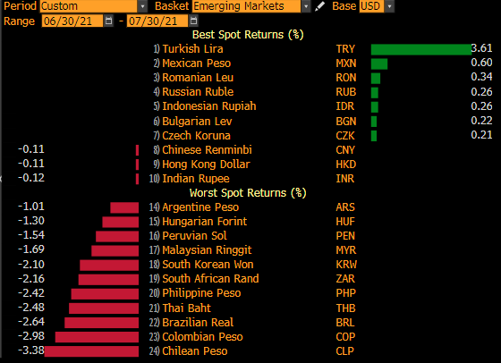 Brooks, gelişen piyasalar içinde Temmuz ayında en büyük getiriyi %3,1 ile TL'nin sağladığını gösteren grafiği paylaşırken "Fed toplantısı sonrasında gelişen piyasa paraları genel olarak iyi performans gösterdi ancak TL bunu ay boyunca yaptı" ifadelerini kullandı.
