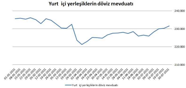Türkiye Cumhuriyet Merkez Bankası(TCMB) tarafından açıklanan verilere göre, bir önceki hafta 230 milyar 314,60 milyon dolar olan yurt içi yerleşiklerin döviz mevduatı 30 Temmuz ile sona eren haftada 231 milyar 646,70 milyon dolara geldi.