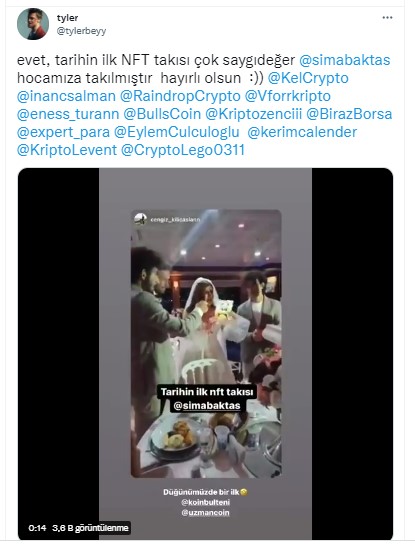 Düğünde gelinle damada takılan NFT altına ait görüntüleri paylaşan "tyler" isimli Twitter kullanıcısı, "tarihin ilk NFT takısı çok saygıdeğer Sima Baktaş hocamıza takılmıştır. Hayırlı olsun" ifadelerini kullandı.