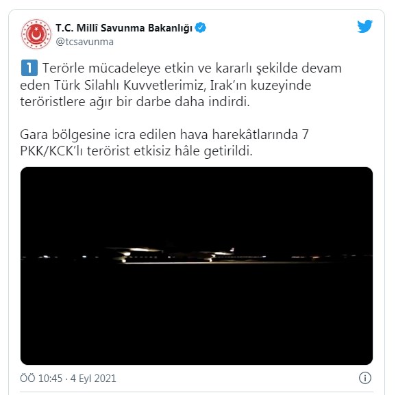 Milli Savunma Bakanlığından yapılan açıklamada şu ifadelere yer verildi: "Terörle mücadeleye etkin ve kararlı şekilde devam eden Türk Silahlı Kuvvetlerimiz, Irak’ın kuzeyinde teröristlere ağır bir darbe daha indirdi. Gara bölgesine icra edilen hava harekâtlarında 7 PKK/KCK’lı terörist etkisiz hâle getirildi."