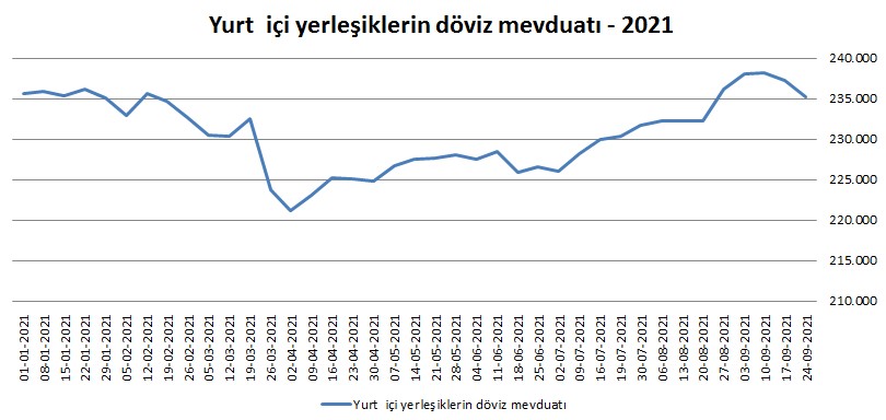 Türkiye Cumhuriyet Merkez Bankası(TCMB) tarafından açıklanan verilere göre, bir önceki hafta 237 milyar 297,4 milyon dolar olan yurt içi yerleşiklerin döviz mevduatı 24 Eylül ile sona eren haftada 235 milyar 161,90 milyon dolara geldi.