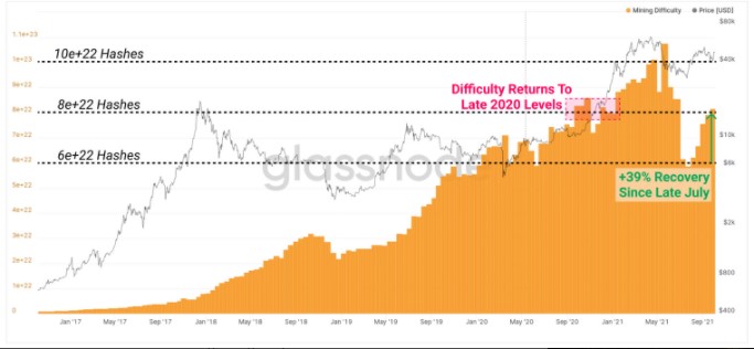 Glassnode, 4 Ekim tarihli Zincir Üstünde Bir Hafta raporunda mayıs ayında Çin'in sektöre baskı uygulamaya başlamasıyla birlikte yüzde 50 düşen hash oranının büyük oranda toparlandığını açıkladı. Hash oranı, Emek İspatı ağların toplam hesaplama gücünü ifade eder.