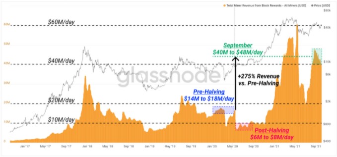 Glassnode, mevcut durumda 40 milyon dolar olan günlük madencilik kârlılığının Mayıs 2020'den beri yüzde 275 artış gösterdiğini açıkladı. Madencilik zorluğu, günlük kârın 6-8 milyon dolar aralığında olduğu Haziran 2020'ye göre ise yaklaşık yüzde 630 artış gösterdi.
