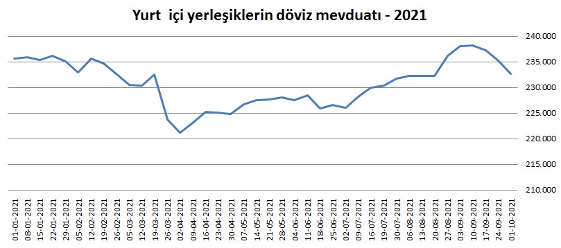 Türkiye Cumhuriyet Merkez Bankası(TCMB) tarafından açıklanan verilere göre, bir önceki hafta 235 milyar 161,9 milyon dolar olan yurt içi yerleşiklerin döviz mevduatı 1 Ekim ile sona eren haftada 232 milyar 684,0 milyon dolara geldi.