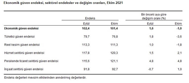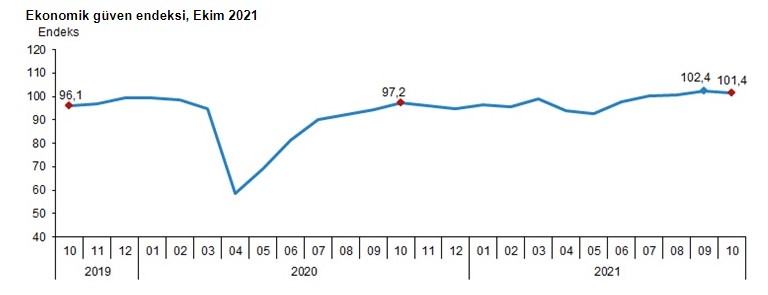 Türkiye İstatistik Kurumu'ndan yapılan açıklamaya göre, ekonomik güven endeksi Eylül ayında 102,4 iken, Ekim ayında %1,0 oranında azalarak 101,4 değerine düştü. Ekonomik güven endeksindeki düşüş, tüketici ve reel kesim (imalat sanayi) güven endekslerindeki düşüşlerden kaynaklandı.
