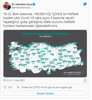 Sağlık Bakanı Fahrettin Koca, 16-22 Ekim'de illere göre her 100 bin kişide görülen Kovid-19 vaka sayılarını açıkladı.