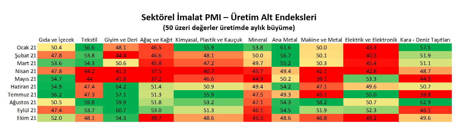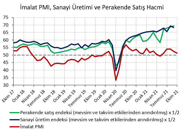 "Arz kaynaklı sorunlar nedeniyle üretimdeki yavaşlama Ekim ötesinde de sürebilir. Ancak dış talep koşulları büyümeyi desteklemeye devam ediyor. Avrupa ve ABD büyümesi hız kesse de halen gücünü koruyor. Ekim ayında ihracatın 20,8 milyar dolar ile rekor tazelemesi ve yeni ihracat siparişlerinin artmaya devam etmesi dış talebin destekleyici olmaya devam edeceğini gösteriyor.