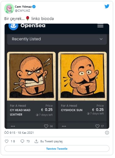 Cem Yılmaz, Twitter hesabından yaptığı paylaşımında, "Bir çeyrek... linko bioda" ifadeleriyle yeni NFT serisinin satışa açıldığını duyurdu.