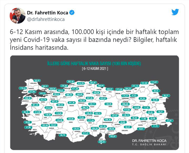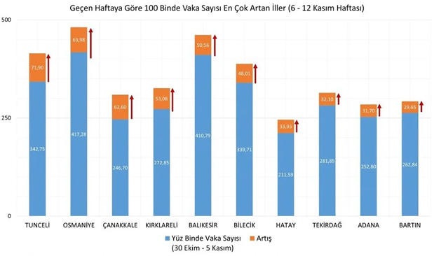 6-12 Kasım arasında vaka yoğunluğu bir önceki haftaya göre en çok artan 10 il şöyle sıralandı: Tunceli, Osmaniye, Çanakkale, Kırklareli, Balıkesir, Bilecik, Hatay, Tekirdağ, Adana, Bartın.