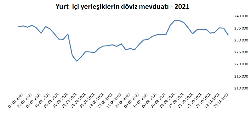 Türkiye Cumhuriyet Merkez Bankası(TCMB) tarafından açıklanan verilere göre, bir önceki hafta 235 milyar 40 milyon dolar olan yurt içi yerleşiklerin döviz mevduatı 26 Kasım ile sona eren haftada 232 milyar 76,7 milyon dolara geldi.