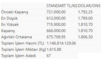 Altın piyasasında, en düşük 612 bin lira, en yüksek ise 715 bin 900 lirayı gören standart altının kilogram fiyatı, günü önceki kapanışa göre yüzde 7,6 düşüşle 666 bin liradan tamamladı.