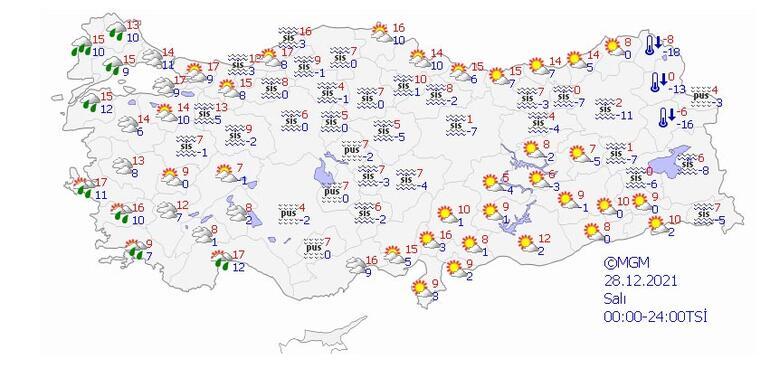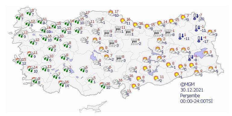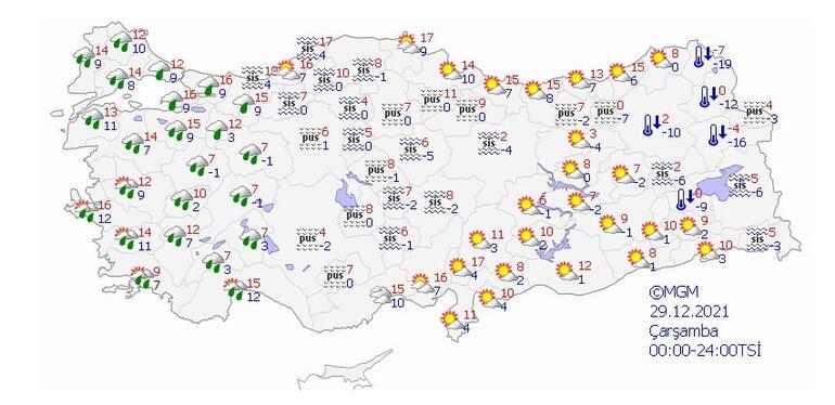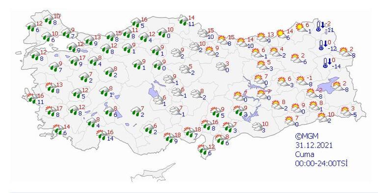 Meteoroloji Genel Müdürlüğü tarafından yapılan son değerlendirmelere göre: ülkenin batı kesimlerinin çok bulutlu, Güney Ege kıyıları, Balıkesir'in batı ilçeleri, Antalya’nın doğu kesimleri ile Edirne ve Kırklareli çevrelerinin sağanak yağışlı, Çankırı çevrelerinin hafif kar yağışlı, diğer yerlerin parçalı ve az bulutlu geçeceği tahmin ediliyor. Yağışların Balıkesir'in batı kesimlerinde yerel olarak kuvvetli olması bekleniyor. İç ve doğu kesimlerde buzlanma ve don ile birlikte yer yer pus ve sis bekleniyor.
