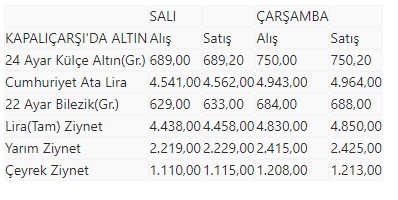 Kapalıçarşı'da alınıp satılan altın türlerinin, önceki ve bugün itibarıyla kapanış fiyatları (TL) şöyle: