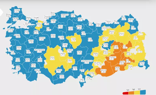 En az iki doz aşı yapılanların oranının en düşük olduğu iller ise Şanlıurfa, Batman, Siirt, Diyarbakır, Muş, Bingöl, Mardin, Bitlis, Ağrı ve Elazığ olarak sıralandı.