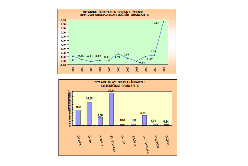 2021 Aralık ayında İstanbul'da; perakende fiyat hareketlerinin göstergesi olan İstanbul Ücretliler Geçinme İndeksi bir önceki aya göre yüzde 9,65, toptan fiyat hareketlerini yansıtan Toptan Eşya Fiyatları indeksi ise yüzde 11,96 oranında arttı.