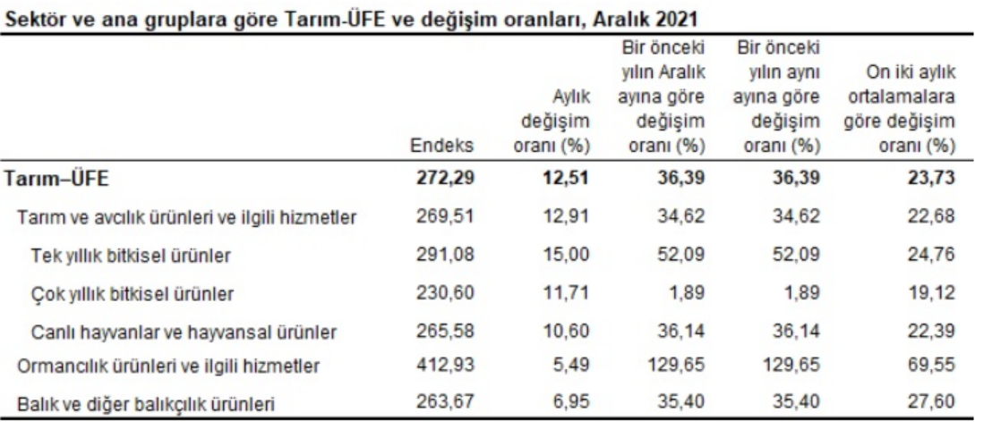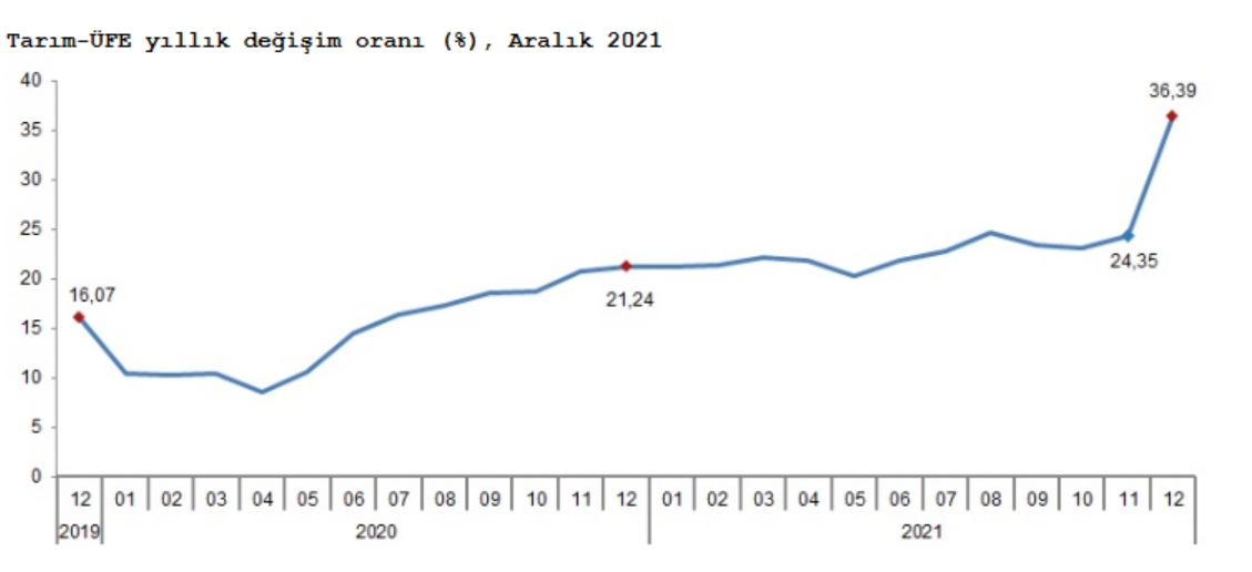 Tarım-ÜFE'de (2015=100), 2021 yılı Aralık ayında bir önceki aya göre %12,51, bir önceki yılın Aralık ayına göre %36,39, bir önceki yılın aynı ayına göre %36,39 ve on iki aylık ortalamalara göre %23,73 artış gerçekleşti.