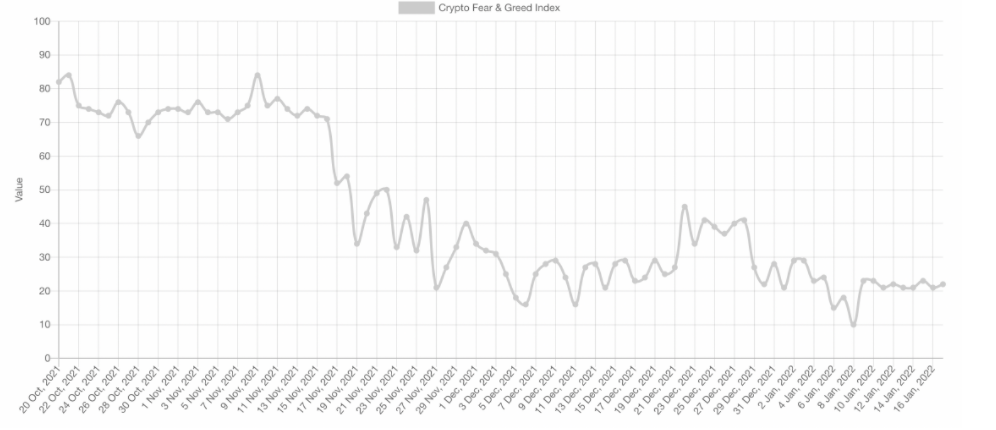 En son 22 Aralık tarihinde 45 ile “korku” seviyesinde izlenen BTC/USD paritesi, o günden bu yana “aşırı korku” seviyesi dolaylarında ilerliyor.