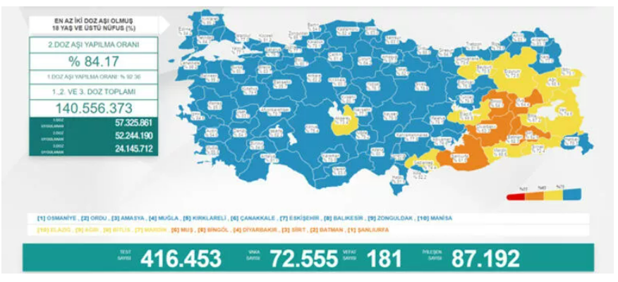 Sağlık Bakanlığı tarafından 22 Ocak 2022 koronavirüs tablosu paylaşıldı. Bakan Koca yaptığı açıklamada, "Son haftalarda günlük vaka sayısının yaklaşık yarısı İstanbul’da tespit ediliyor. İstanbul, şartları sebebiyle hastalığın kolay yayılabildiği bir şehir, tedbirlerin büyük bir ciddiyetle uygulanması gerekiyor. Maske, mesafe kuralına uyup, hatırlatma dozu aşımızı yaptıralım." dedi.